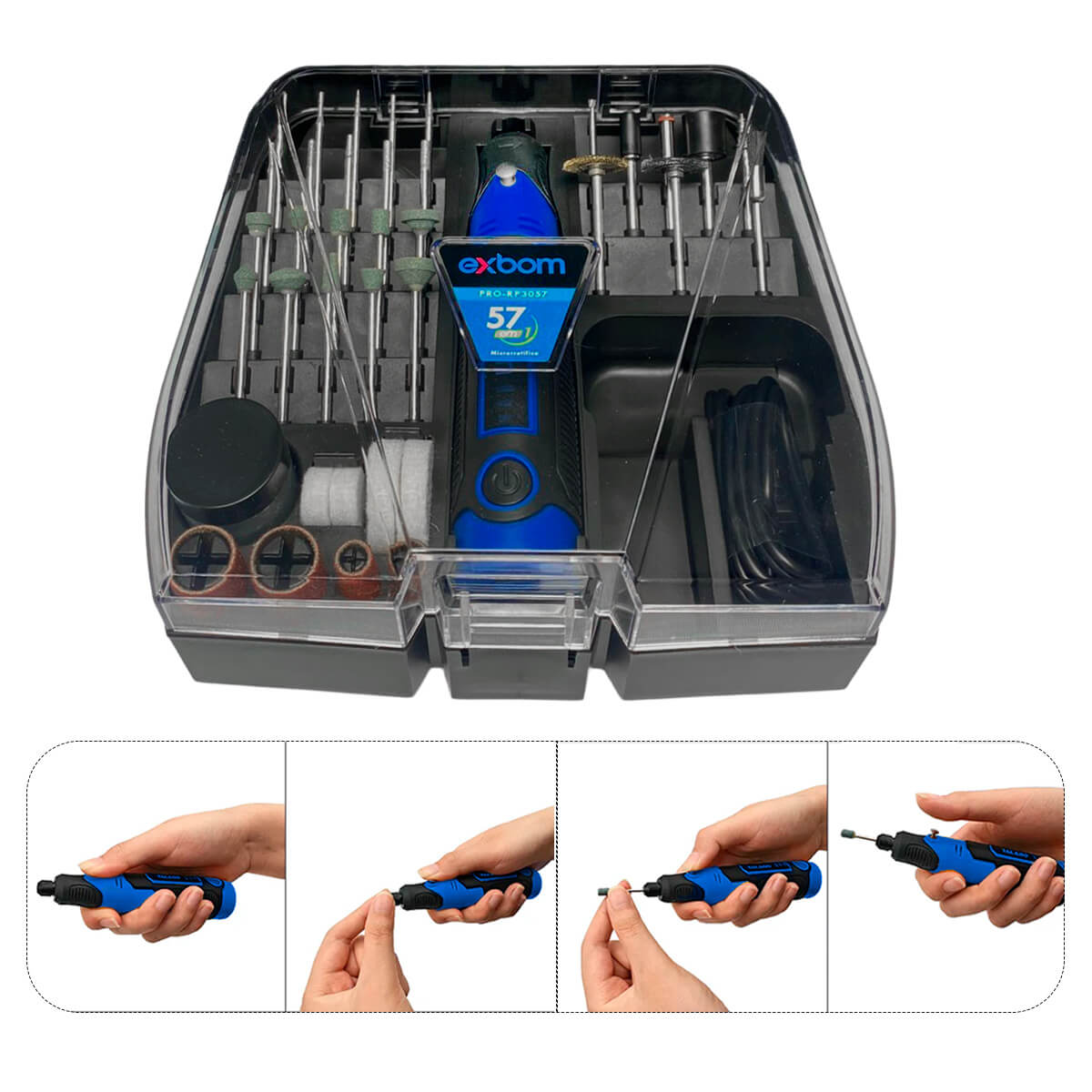 - Acessórios Inclusos (57 em 1): Abrange tarefas como corte, polimento, lixamento, gravação, limpeza e mais