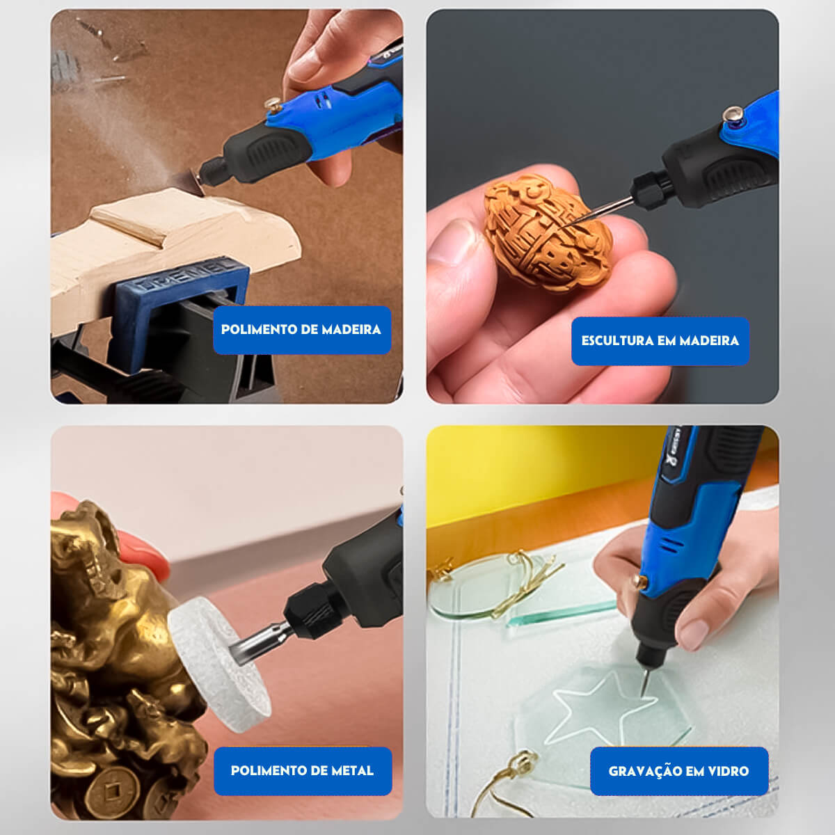 - Uso: Corte, gravação, polimento, lixamento e limpeza
