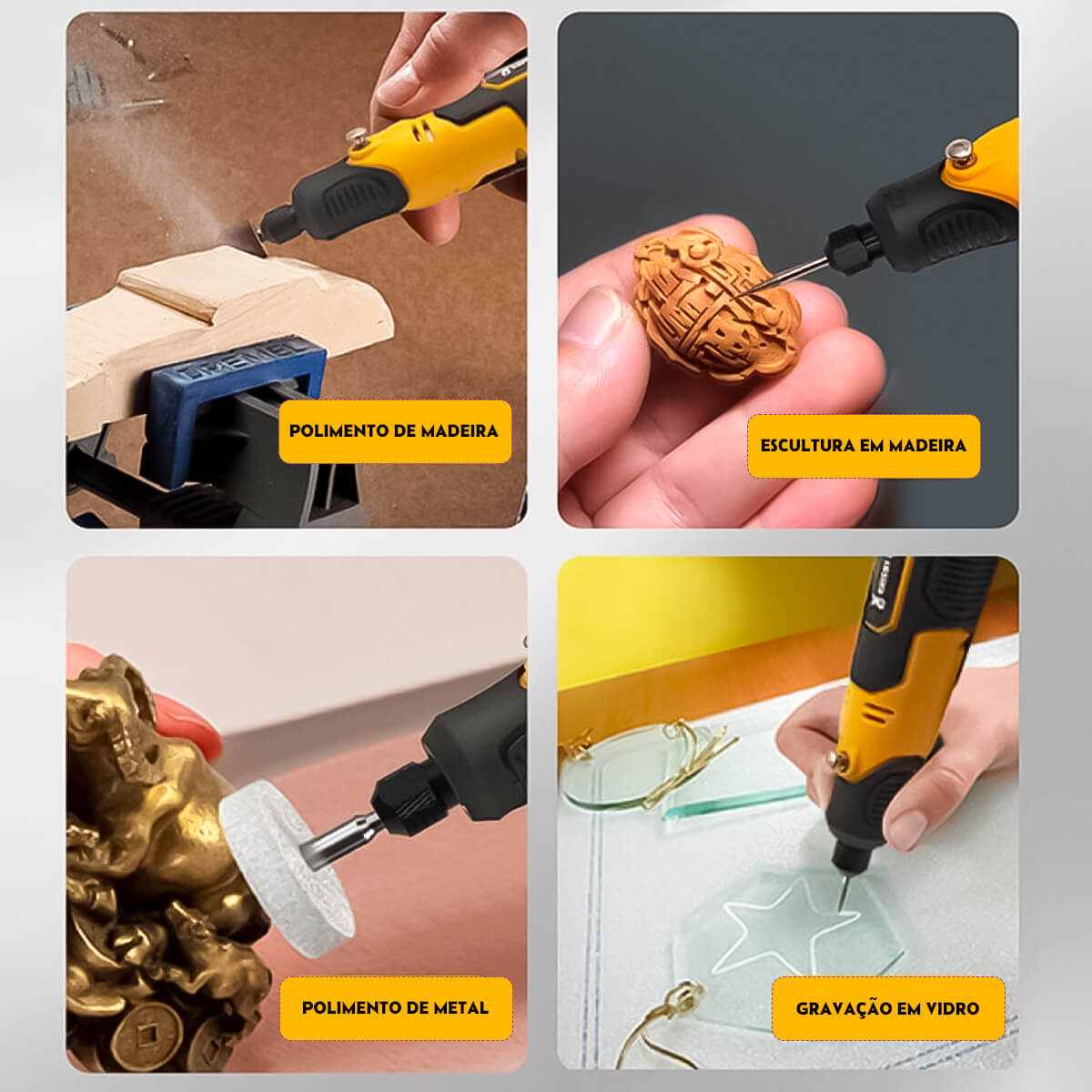 - Uso: Corte, gravação, polimento, lixamento e limpeza